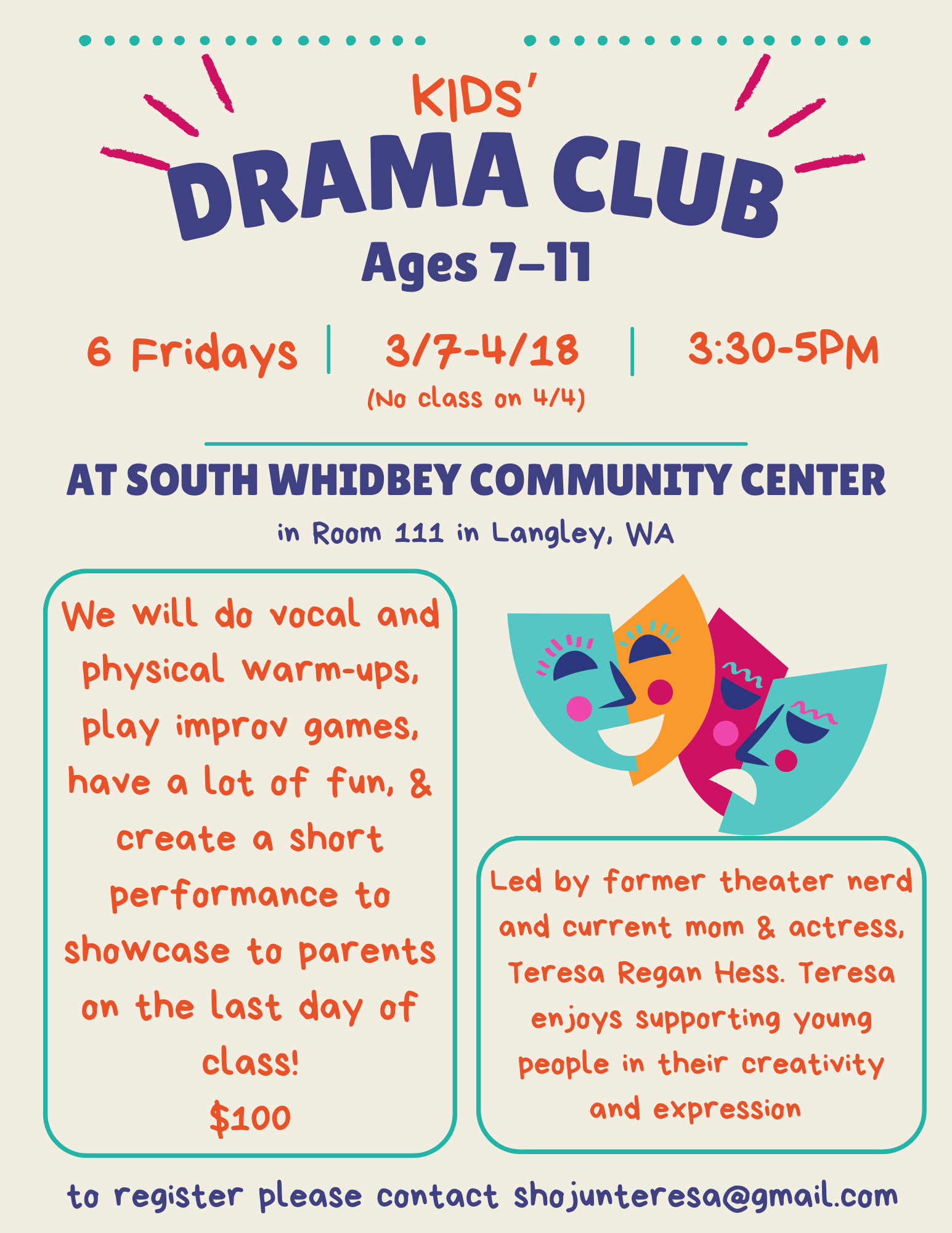 A little about me: I studied theater in high school and college and in the last several years, have been in shows on Whidbey at WICA and Outcast, as well as creating a one-woman show of embodied poetry. I am also a mom to three daughters (the youngest, 9, will be in the class!) and love working with kids and helping them explore creative expression. I have taught classes like this before on my own and through the Whidbey Children’s Theater, homeschooling groups, and through summer camps for kids in Italy back in the day 🙂